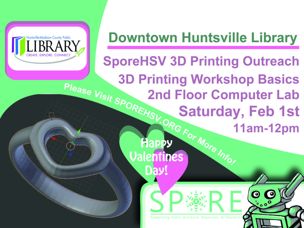 We are hosting a free hands-on workshop for learning the basics of 3D modeling for printing. This class will take place Saturday February 1st, from 11am to 12pm at the Downtown Huntsville Library and will be set up on the 2nd floor in the computer lab area.