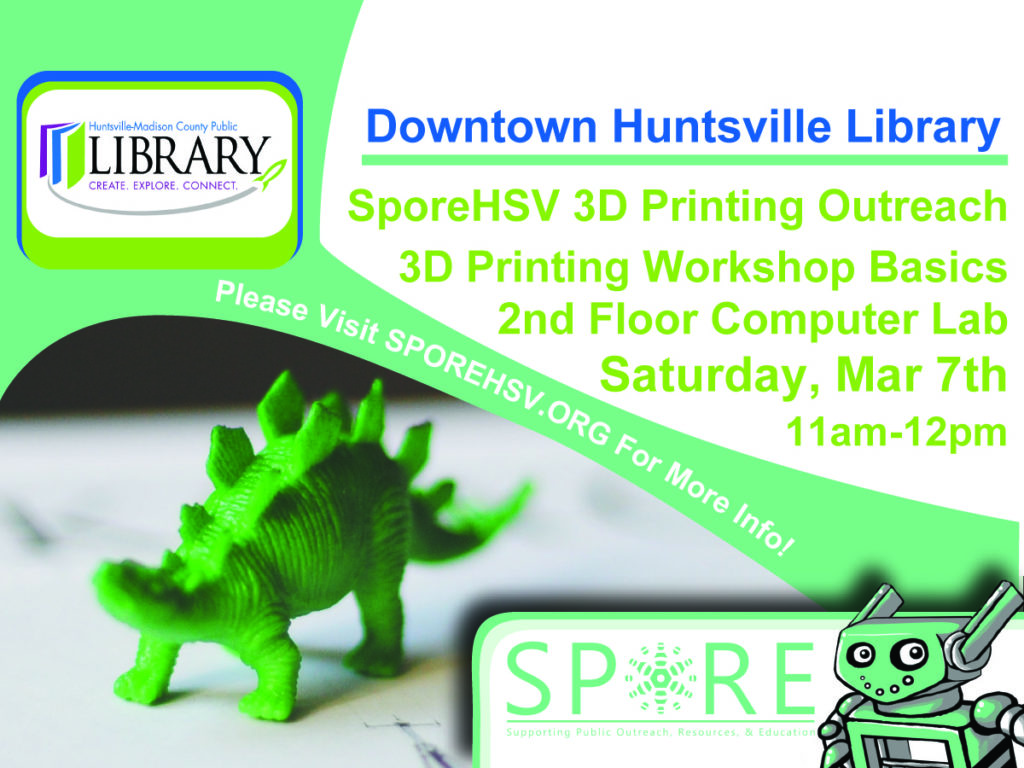 We are hosting a free hands-on workshop for learning the basics of 3D modeling for printing. This class will take place Saturday March 7th, from 11am to 12pm at the Downtown Huntsville Library and will be set up on the 2nd floor in the computer lab area.