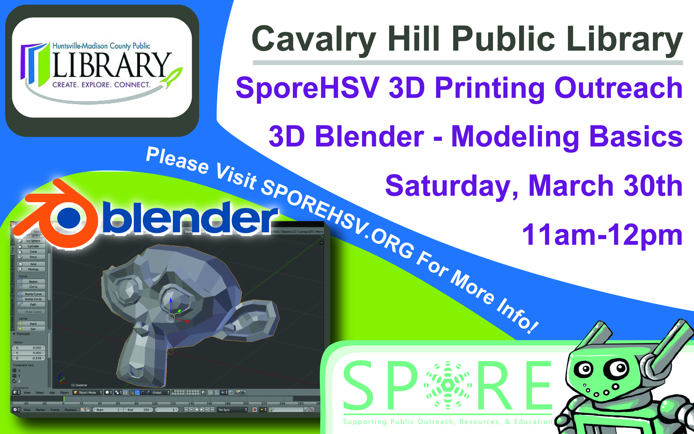 Hello friends! We are having another class at Cavarly Hill Library, Saturday March 30th. At this class, we will do a crash course in 3D…