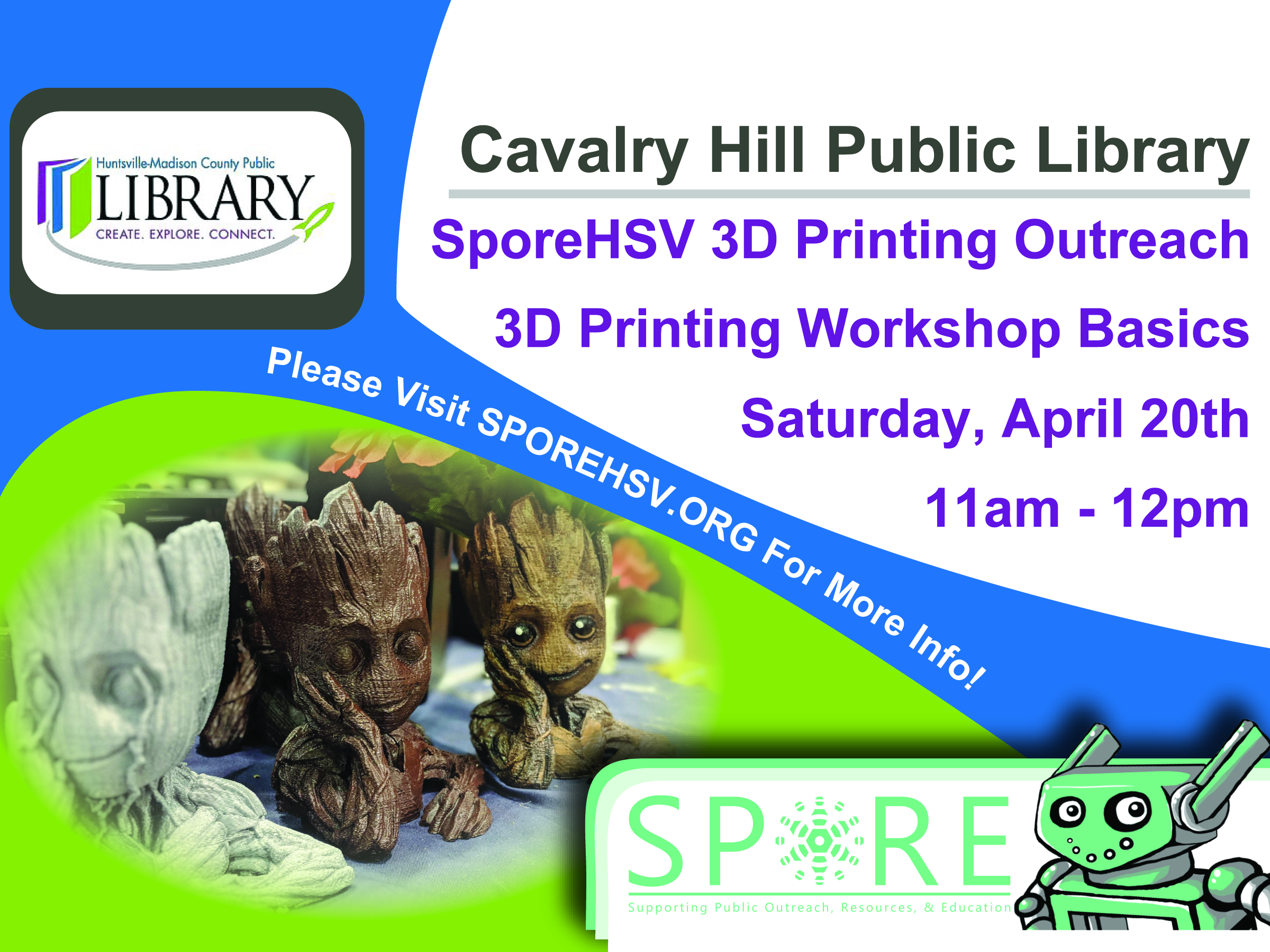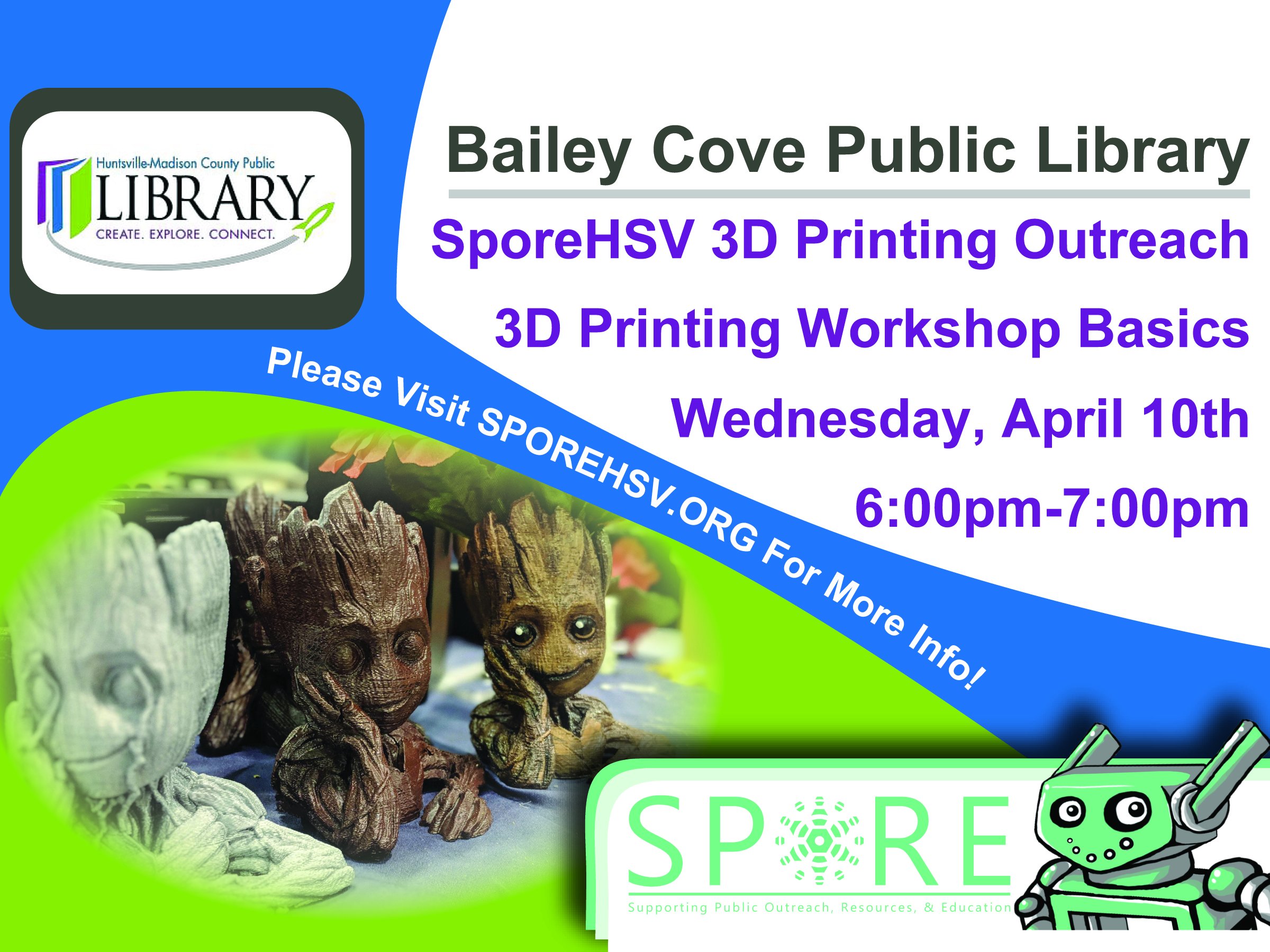 We are very excited to host our first outreach event at the Bailey Cove Library in South Huntsville! This class is on Wednesday, April 10th at 6pm…