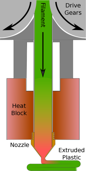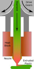 Revision as of 19:59, 24 July 2018 by Meisnerdan (Talk | contribs) (Shows the process of filament melting and getting extruded through a nozzle in typical fused Filament Fabrication (FFF) processes.)